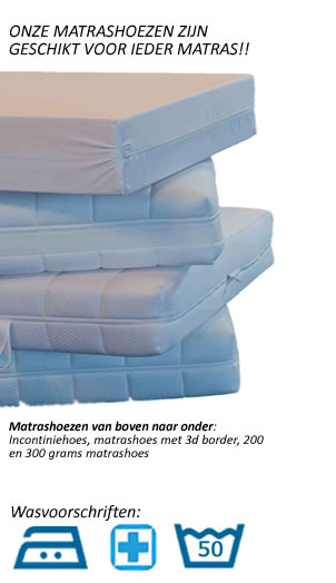 Matrashoes.nl biedt u een uitgebreid assortiment matrashoezen aan. U heeft keuze uit vijf verschillende hoezen die beschikbaar zijn in elk gewenste maat. De DELUXE, The Royal en The Divine zijn gemaakt van een dikke dubbeldoeks tijk die uw bed comfortabel en zacht doet aanvoelen. Zowel The Royal als The Divine zijn uitgevoerd met een 3d coolband. Deze band zorgt ervoor dat uw matraskern goed kan ademen waardoor slijtage minder snel inzet. Doordat uw matras ventileert aan de omgeving, voelt uw bed koeler aan en heeft u minder last aan transpiratie.